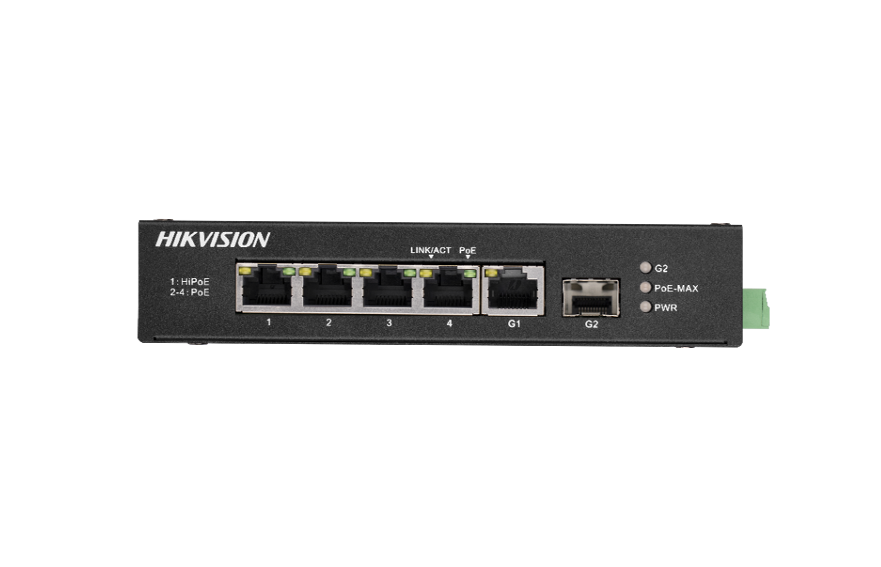 Hikvisoin 4 Port Fast Ethernet Unmanaged Harsh POE Switch, 3 × 100M PoE ports, 1 × Hi-PoE port, 1 × gigabit RJ45 port and 1 × gigabit SFP Fiber Optical Port, 3 year warranty